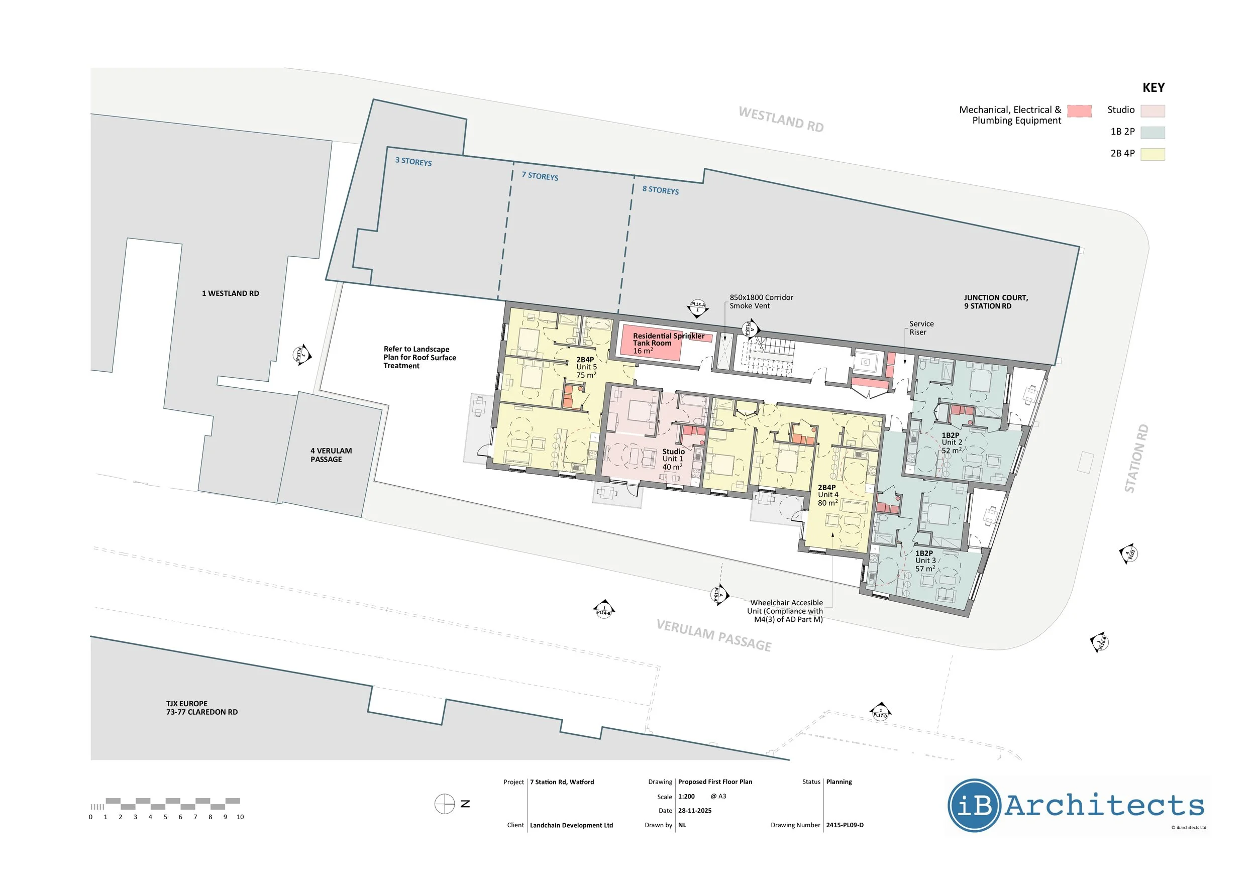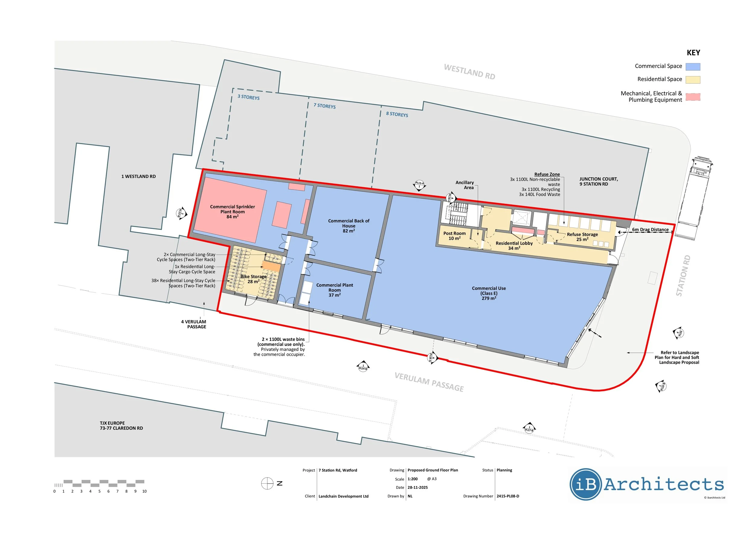 7 Station Road is a planning submission for the redevelopment of a long‑vacant 1960s former bank opposite Watford Junction Station. The proposal replaces an underused building with a contemporary mixed‑use scheme that introduces flexible commercial space at ground floor and 24 new apartments above, while improving the public realm and addressing several long‑standing constraints on this prominent gateway site.
