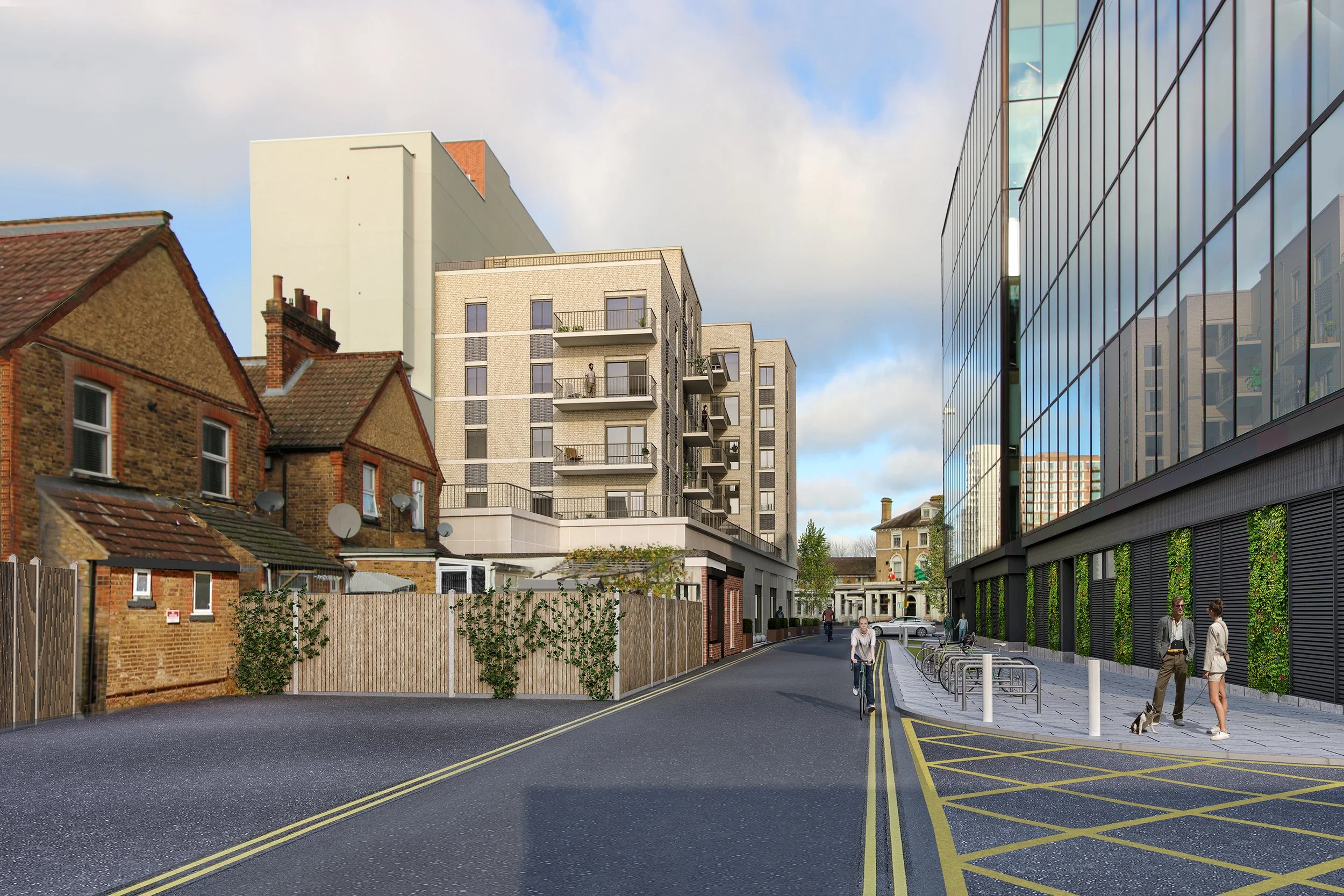 Sustainability principles are proposed throughout with an envelope‑led energy strategy, thoughtful glazing design to reduce overheating, and the integration of SuDS features such as rain gardens into the public realm. The scheme supports car‑free urban living, taking advantage of immediate proximity to national rail, overground and bus services. Cycle storage is provided for all residents and visitors to encourage sustainable travel.